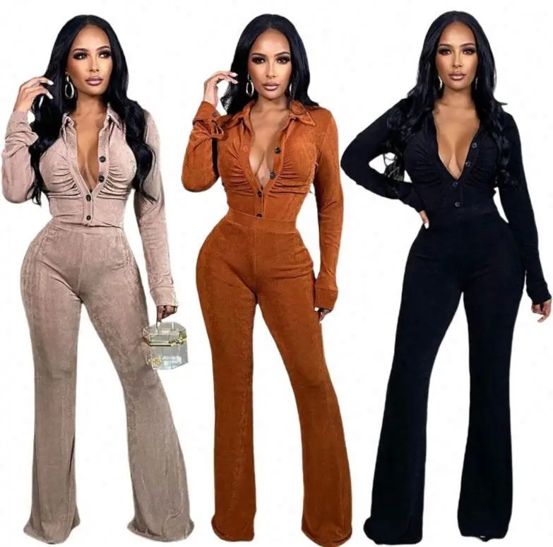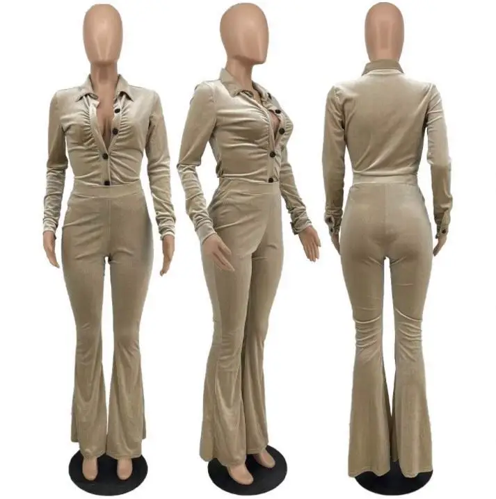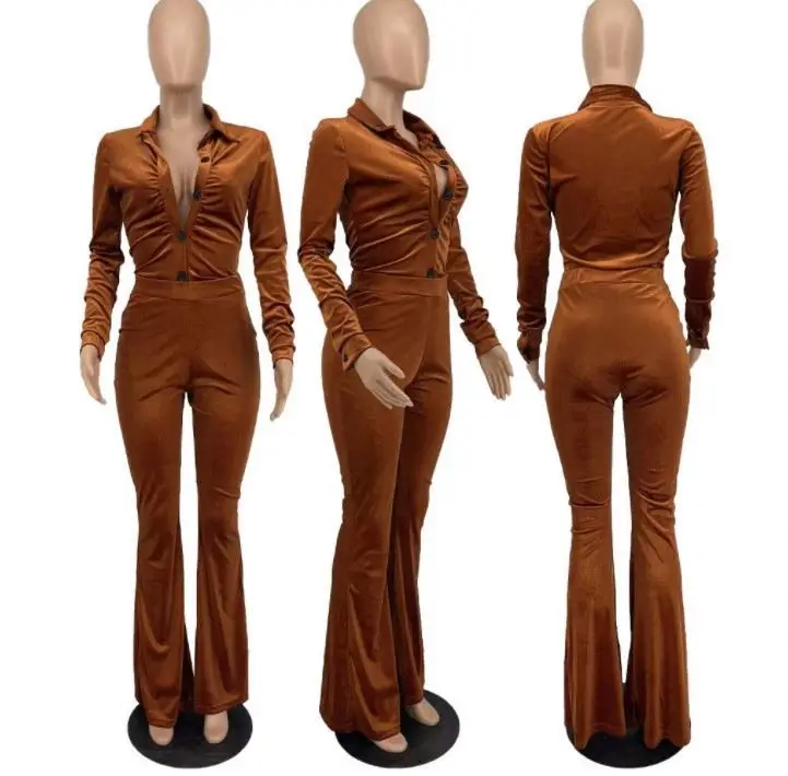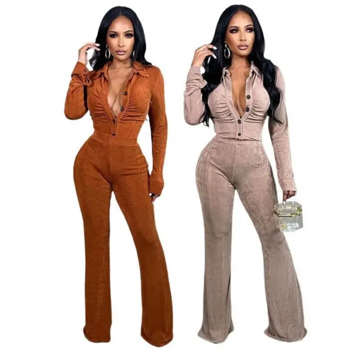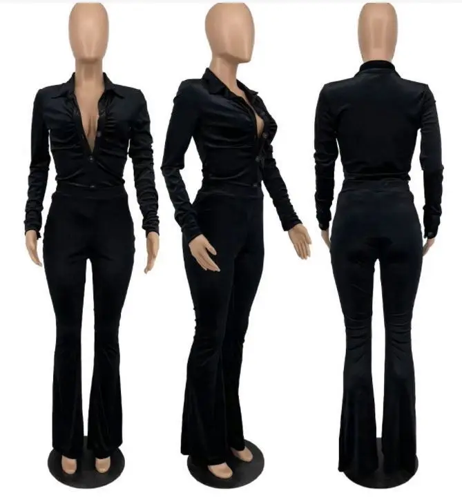 2023 Winter Women v Neck Button up Shirt and Wide Leg Pants Velvet Sexy Eco-friendly Breathable 2 Piece Clothing Set